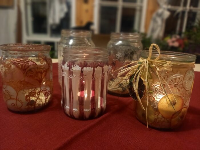 - Visi materiāli (burkas, krāsas, dekoru elementi, sveces).