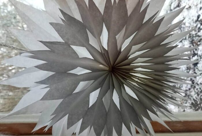 Tēma- papīra bumbas, zvaigznes, telpu dekori baltās noskaņās.