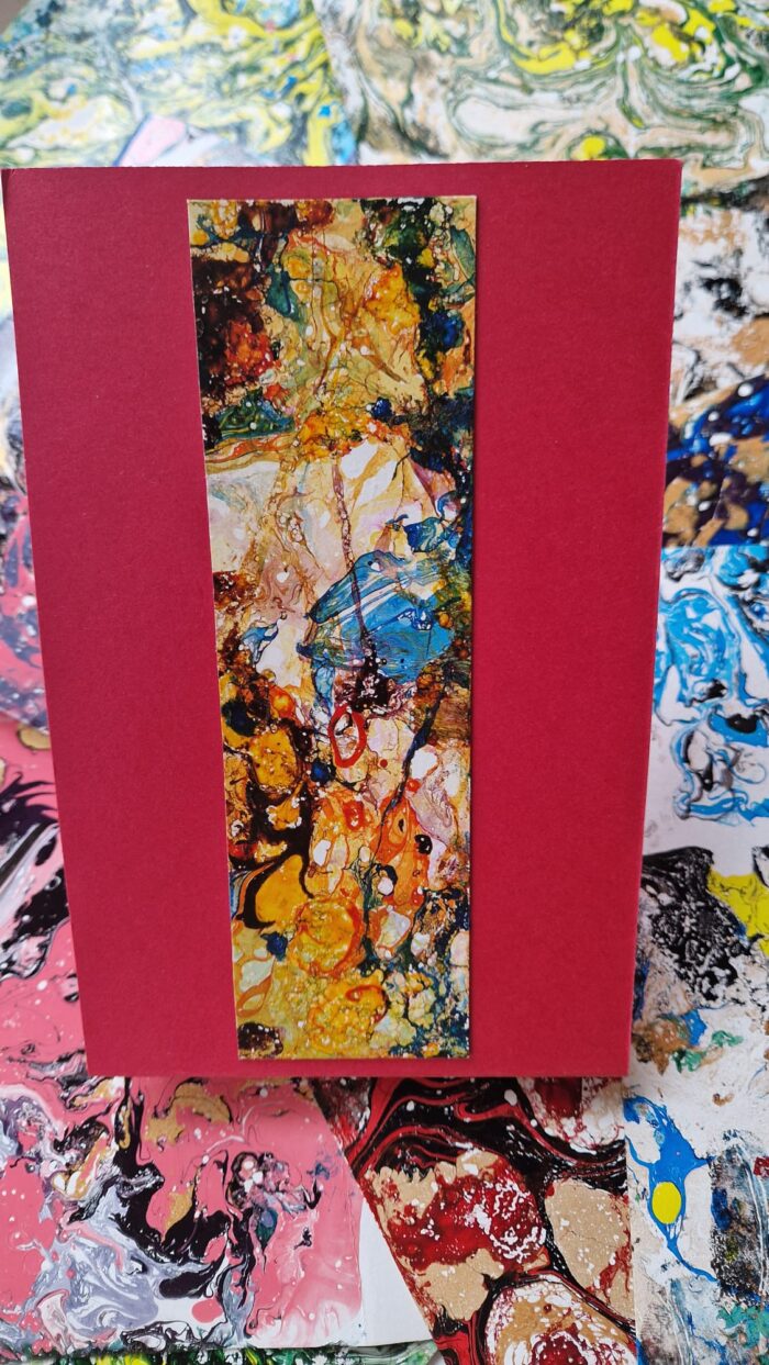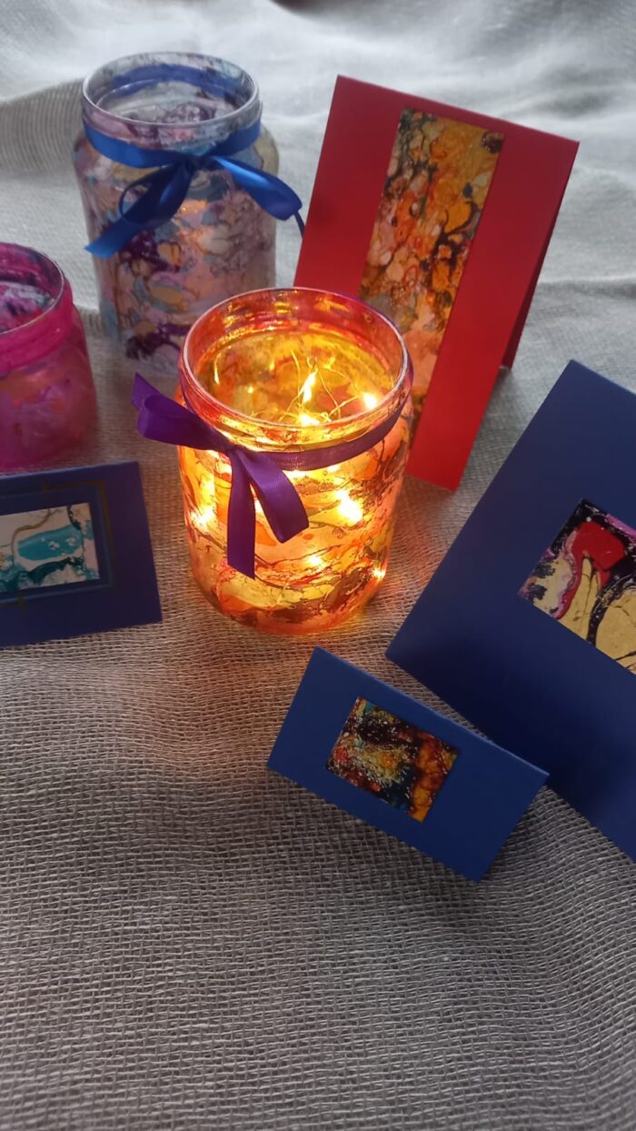 🌟Tēma: marmorizēšanas tehnikā radīti lukturīši un kartiņas- brīvi plūstošas krāsas uz stikla un papīra.