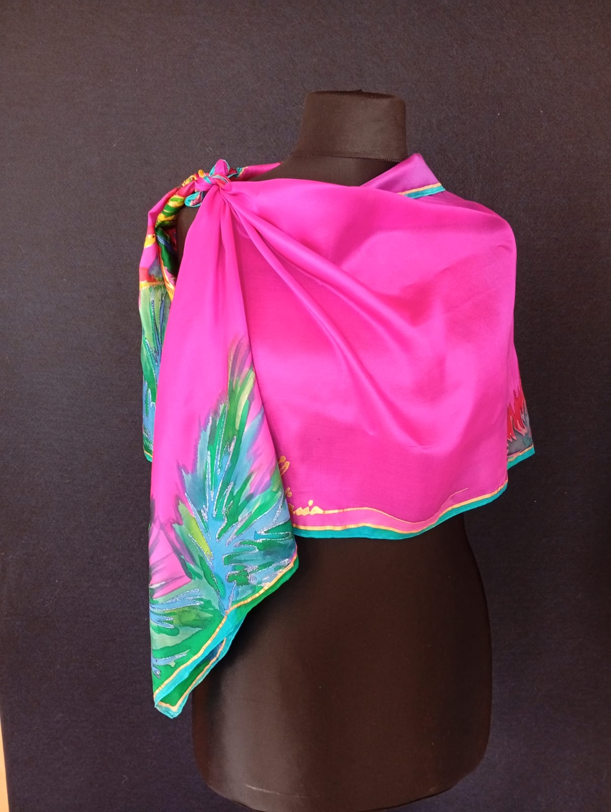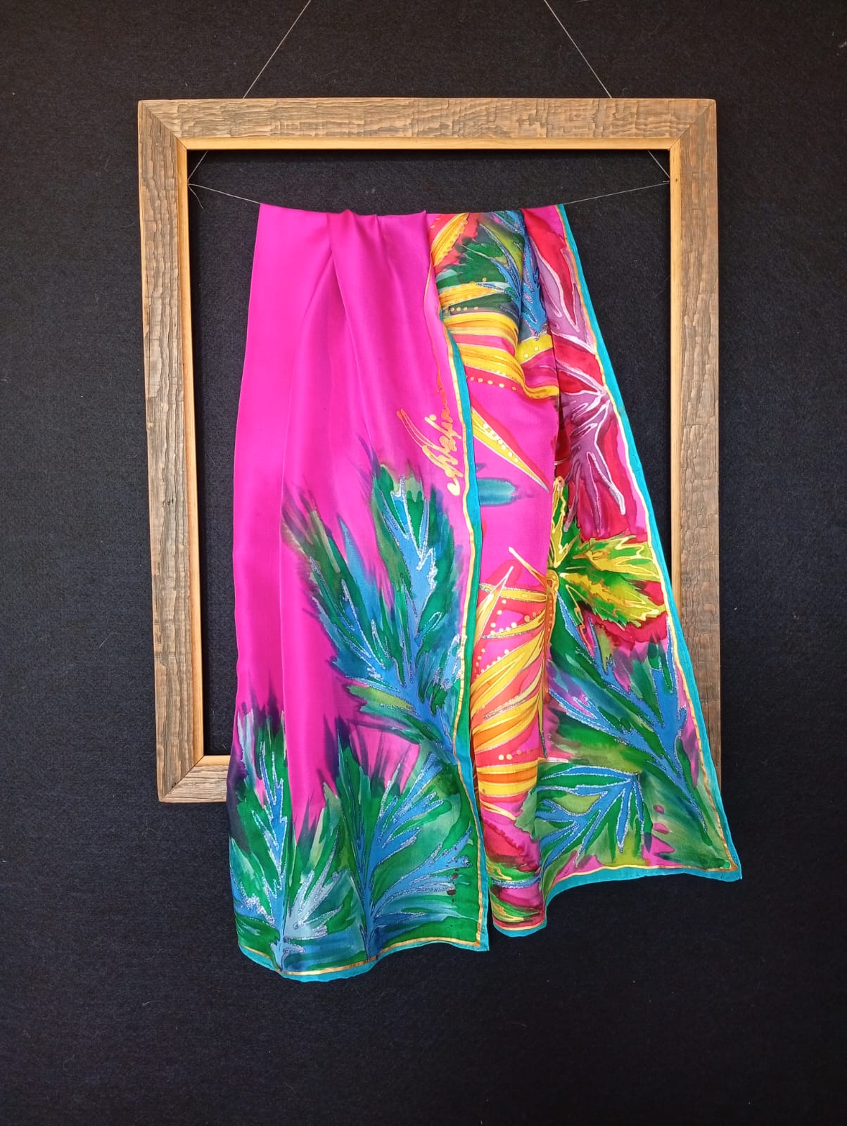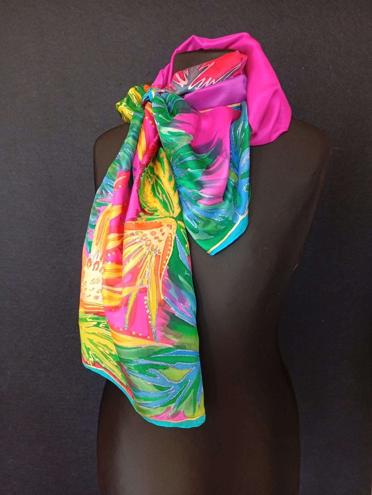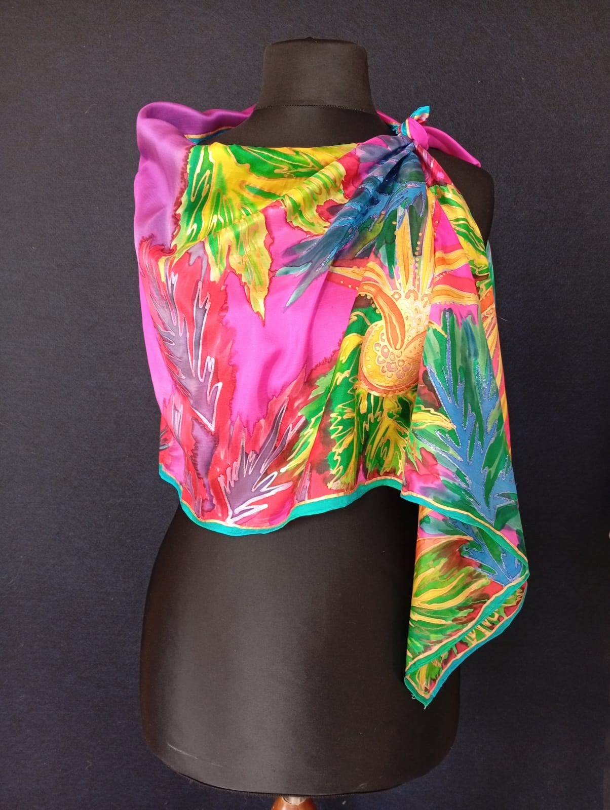 Krāsaina zīda šalle – ar rokām apgleznota tropu dizains – unikāla dāvana sievietei