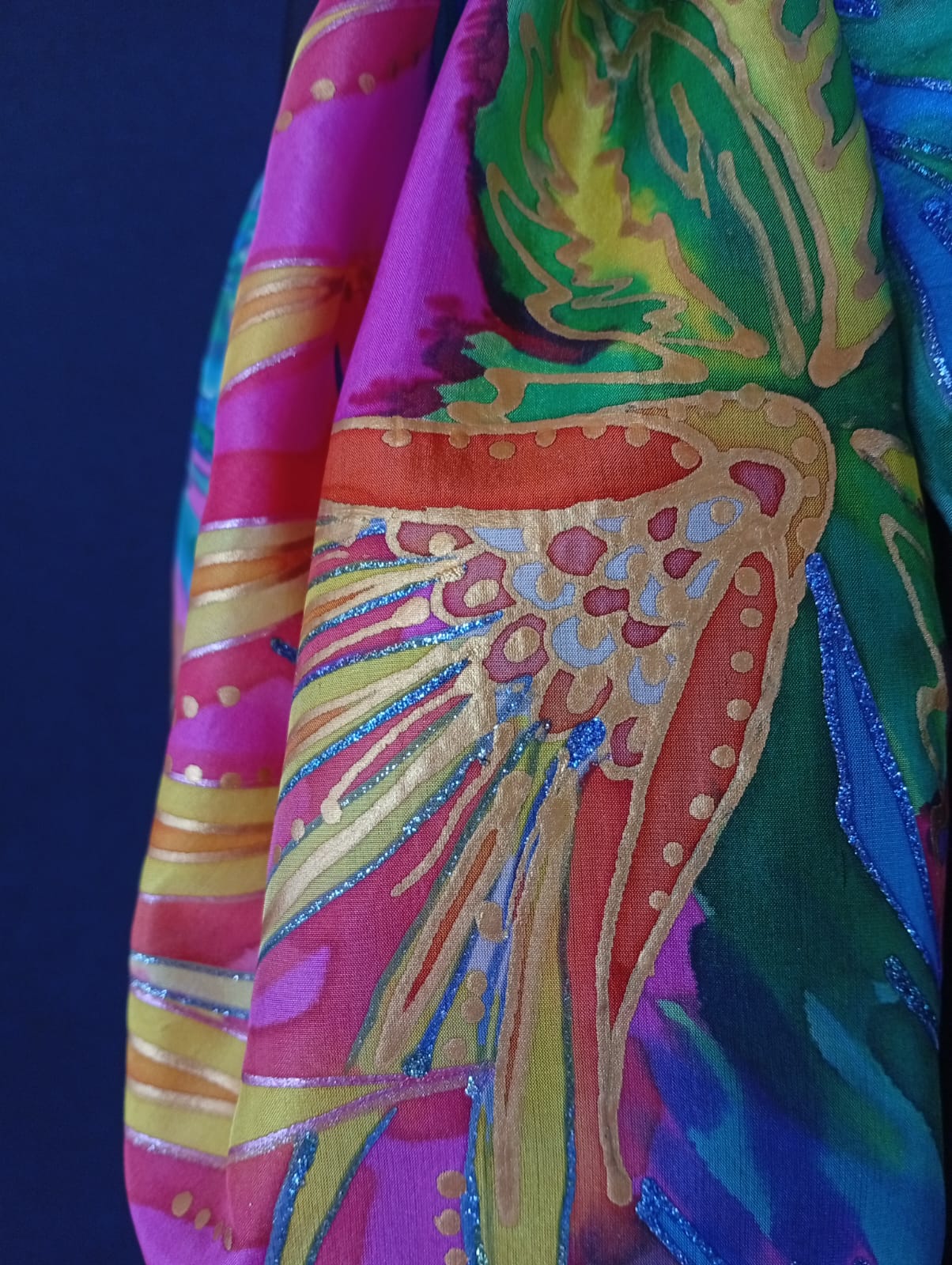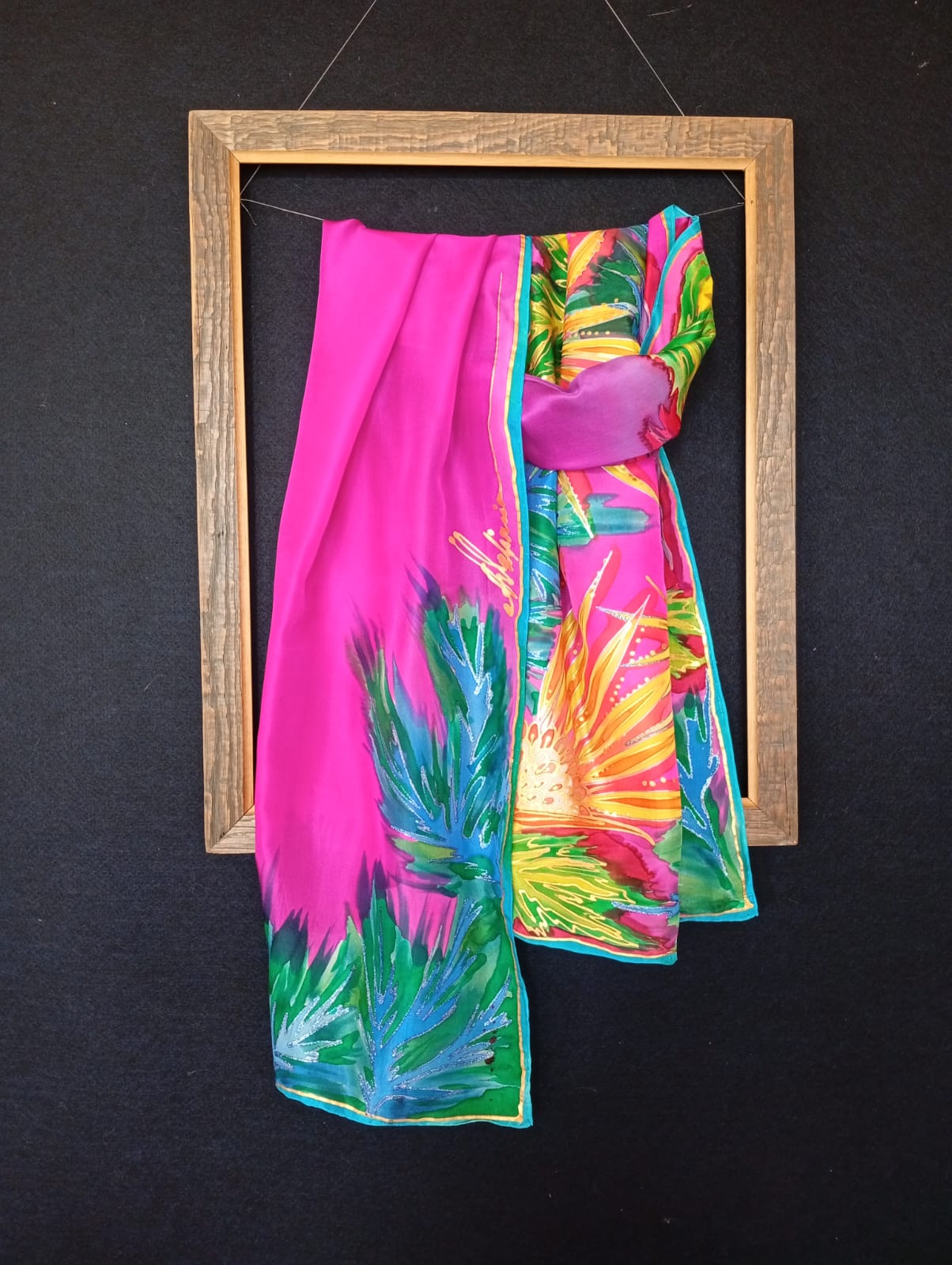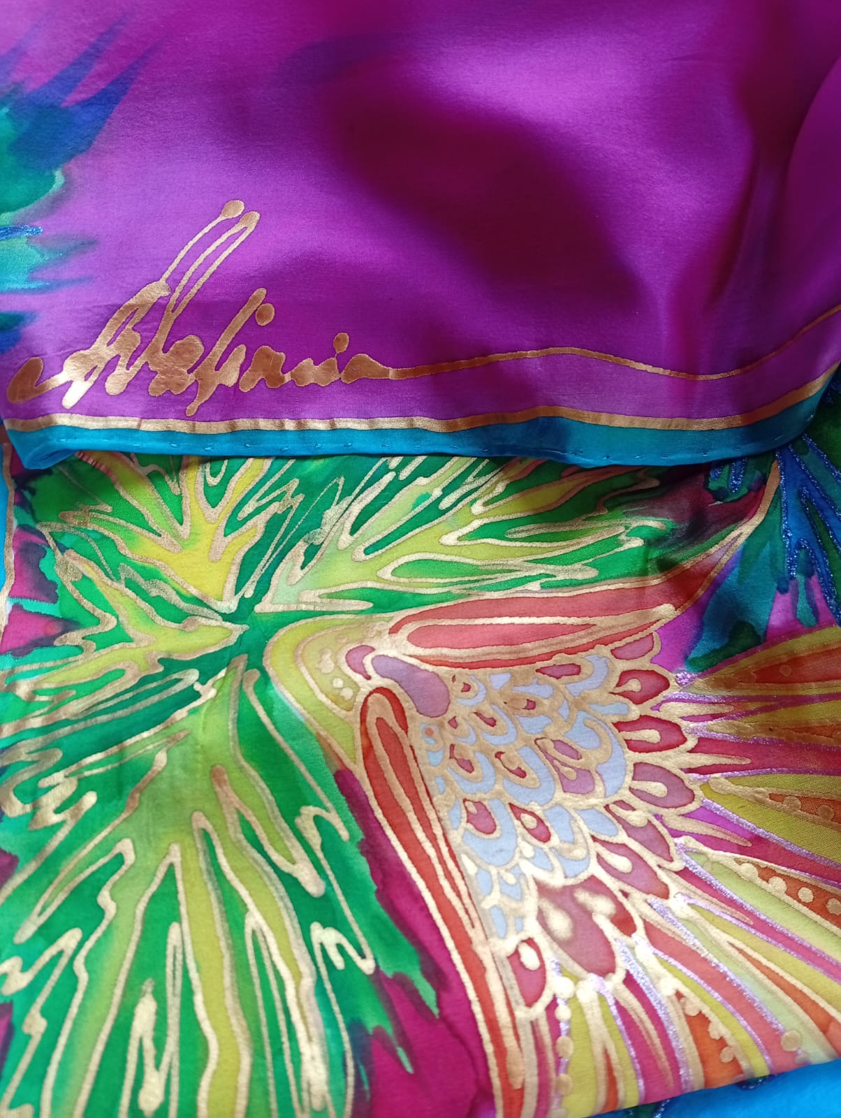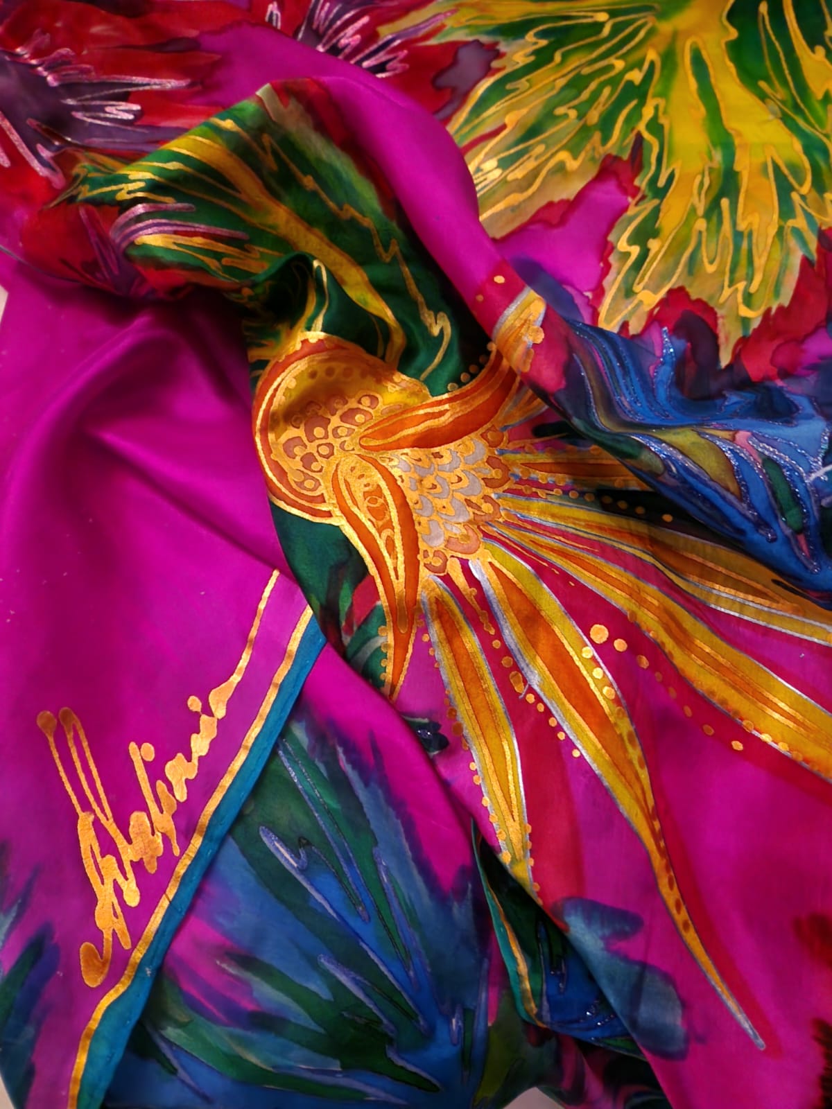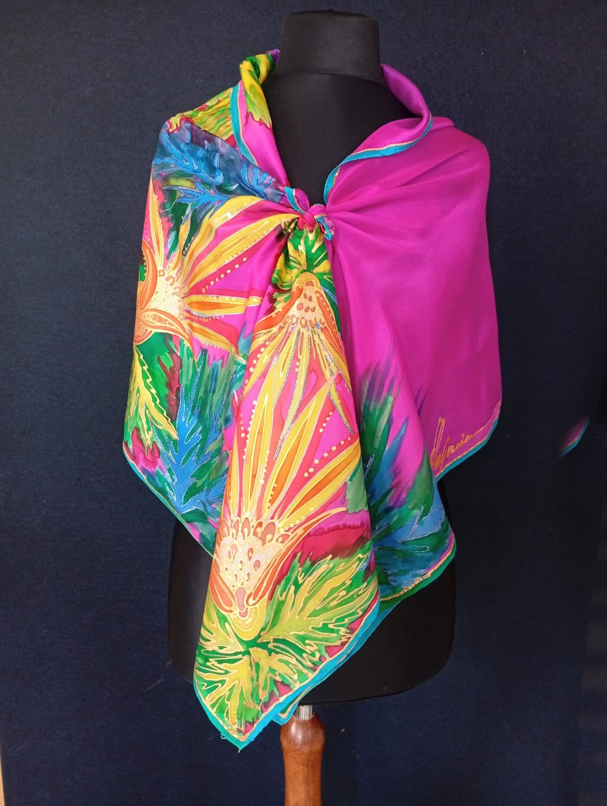 Krāsaina zīda šalle – ar rokām apgleznota tropu dizains – unikāla dāvana sievietei