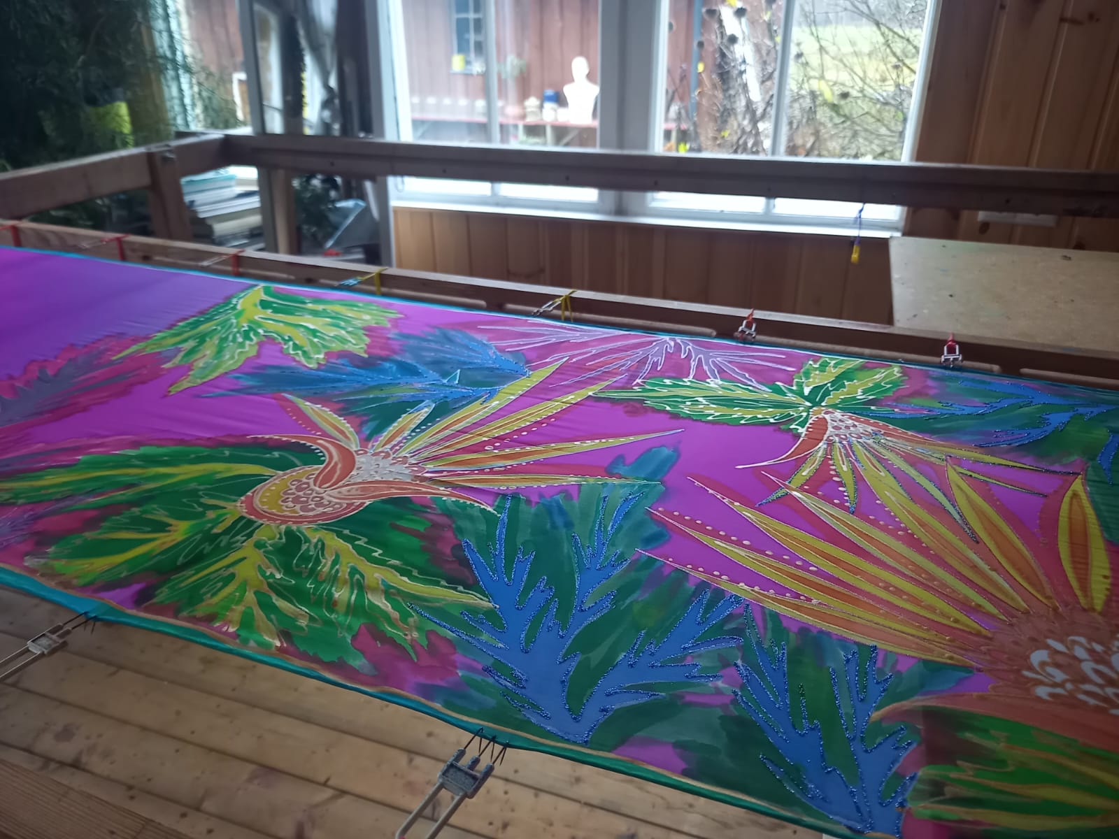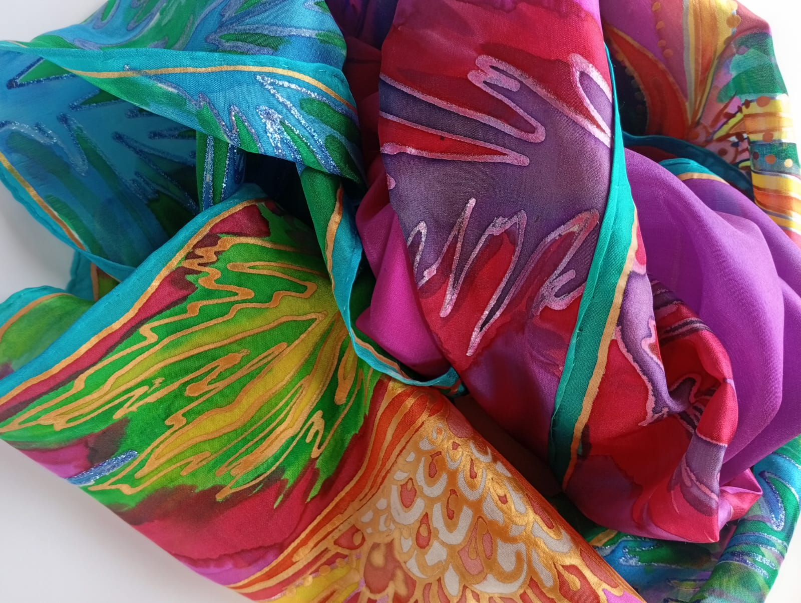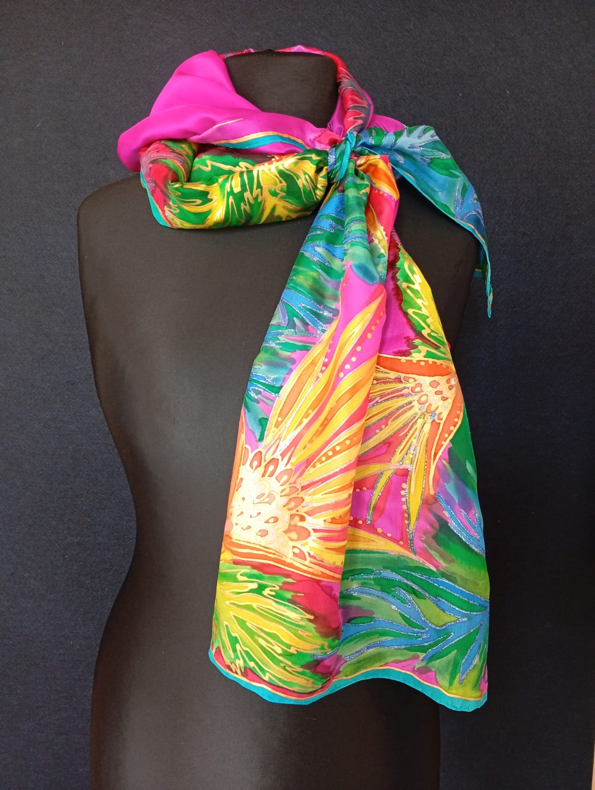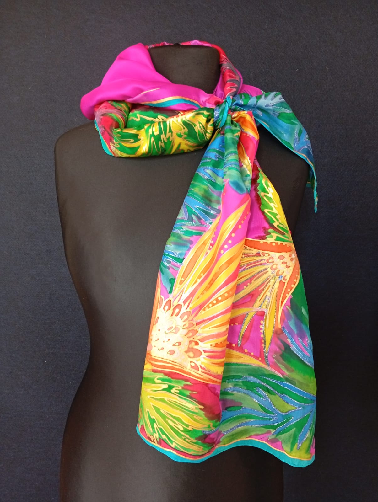 Krāsaina zīda šalle – ar rokām apgleznota tropu dizains – unikāla dāvana sievietei