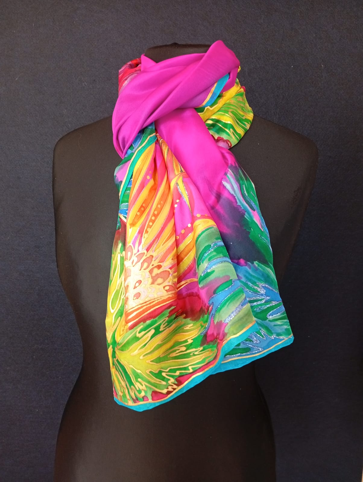Ar rokām apgleznota krāsaina zīda šalle spilgtos rozā, zaļos, dzeltenos un tirkīza toņos ar plūstošiem, botāniskiem motīviem.