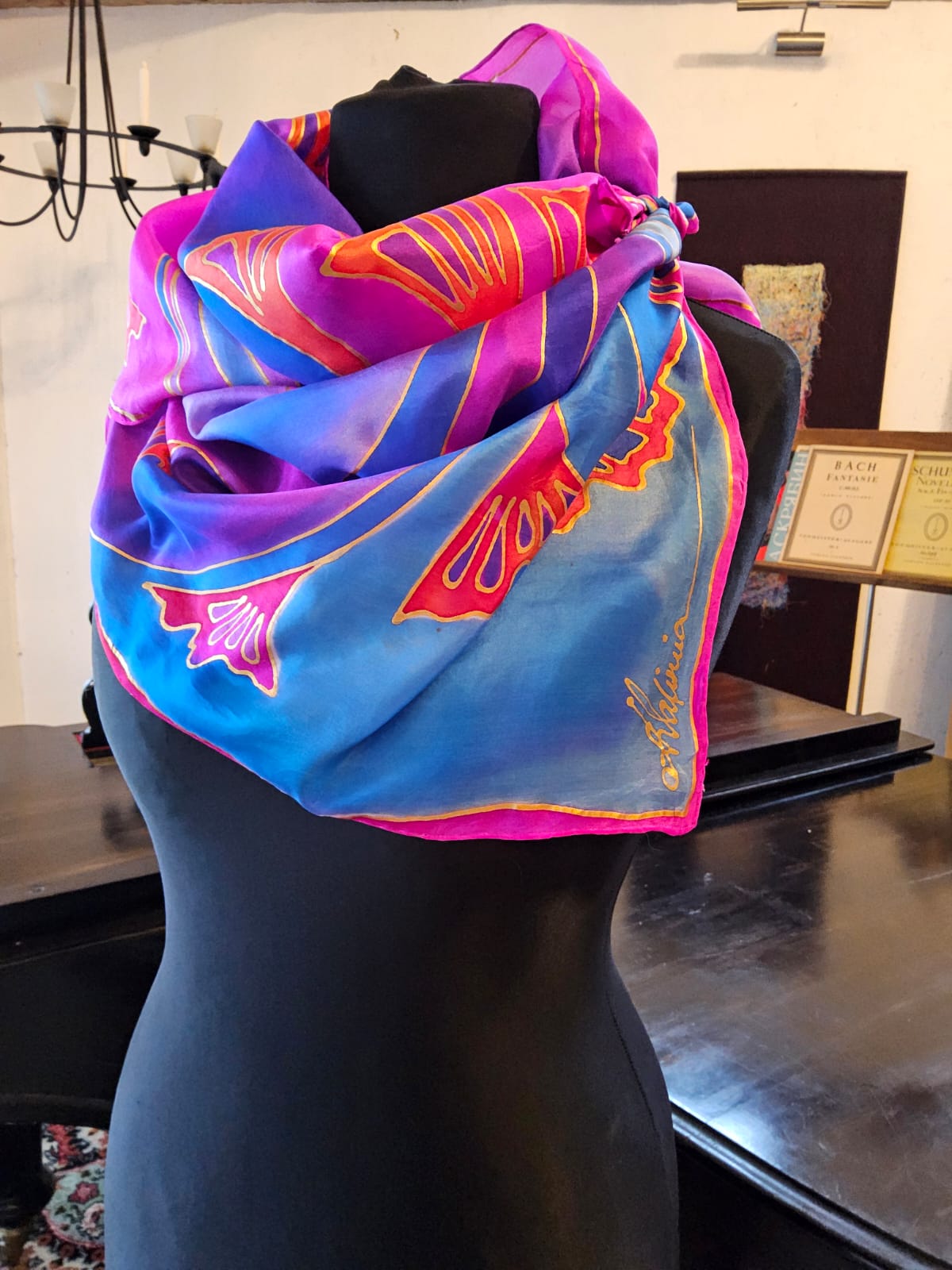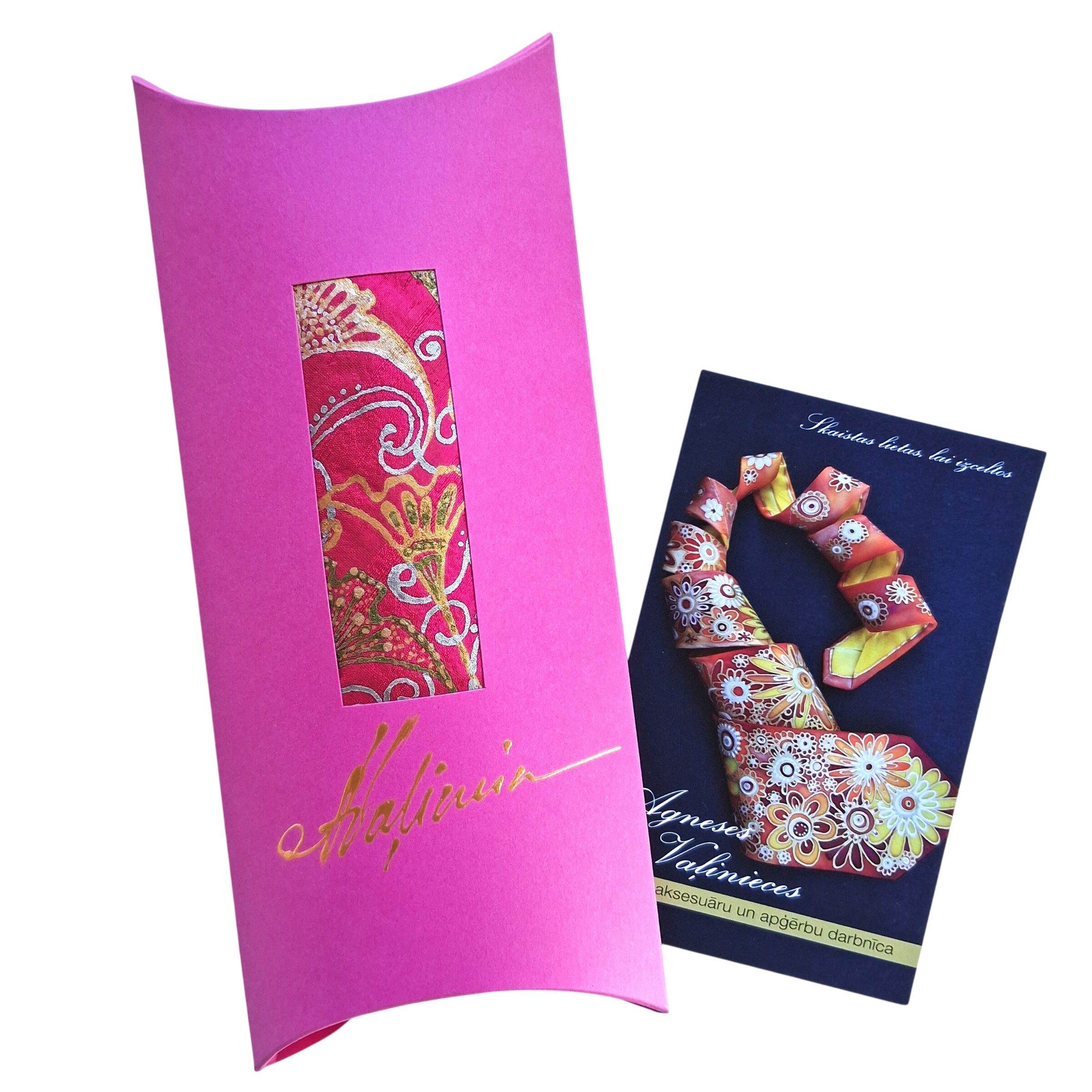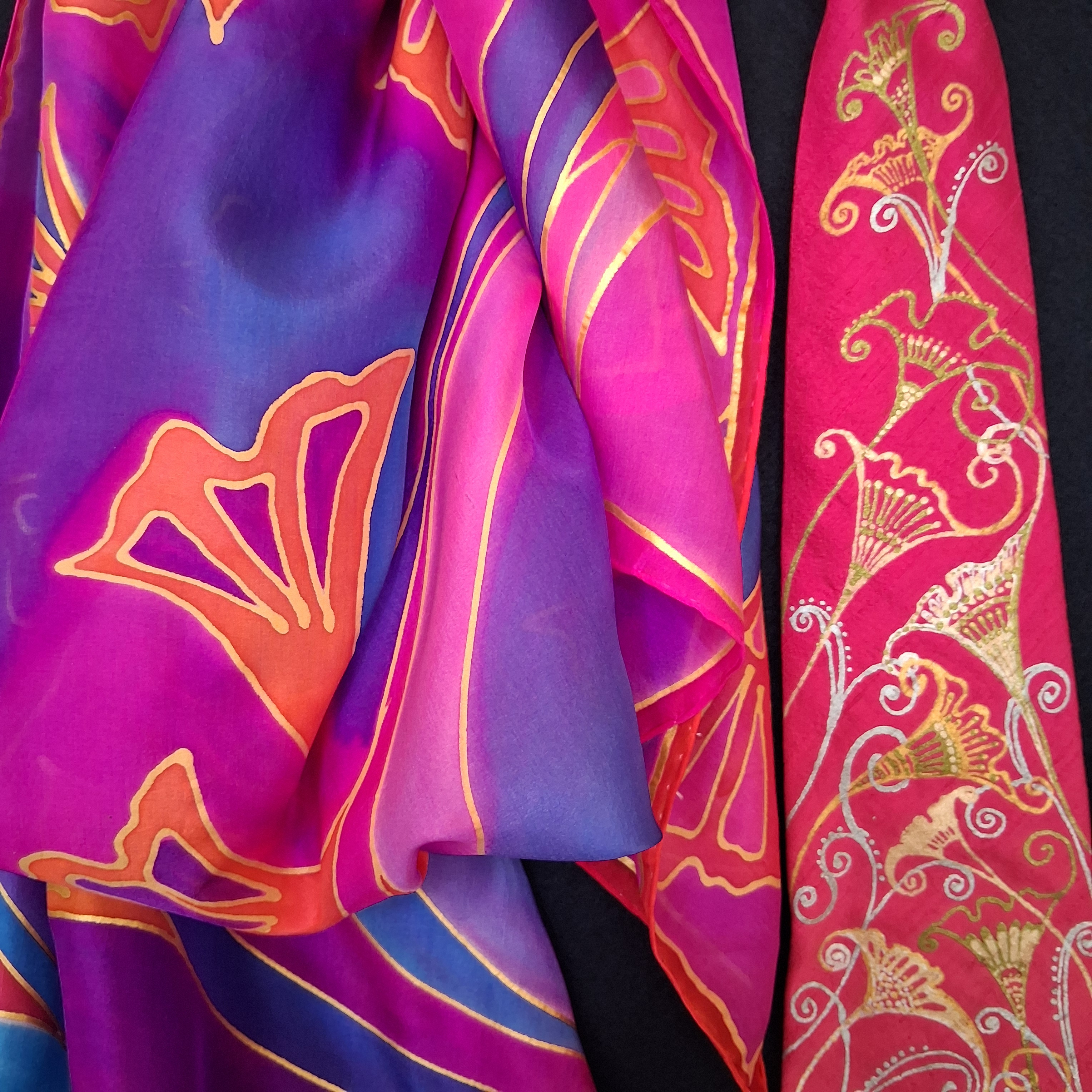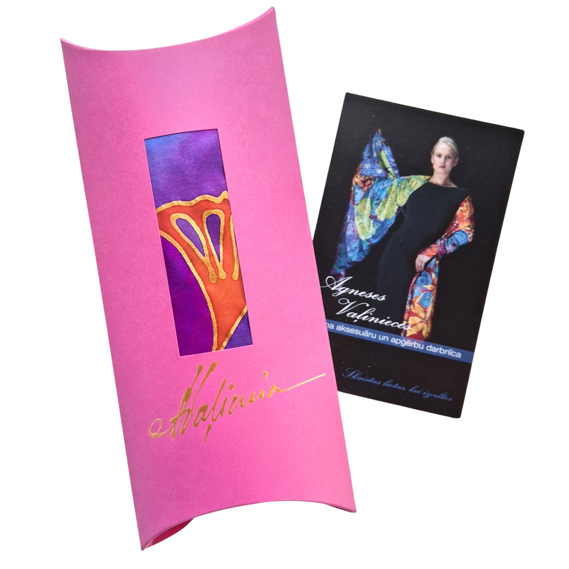 Kaklasaitei ir piesātināts fuksijas tonis ar plūstošiem botāniskiem motīviem zelta un sudraba akcentos, savukārt šalle apvieno violeti zilus un fuksijas toņus maigākā, plūstošā kompozīcijā.