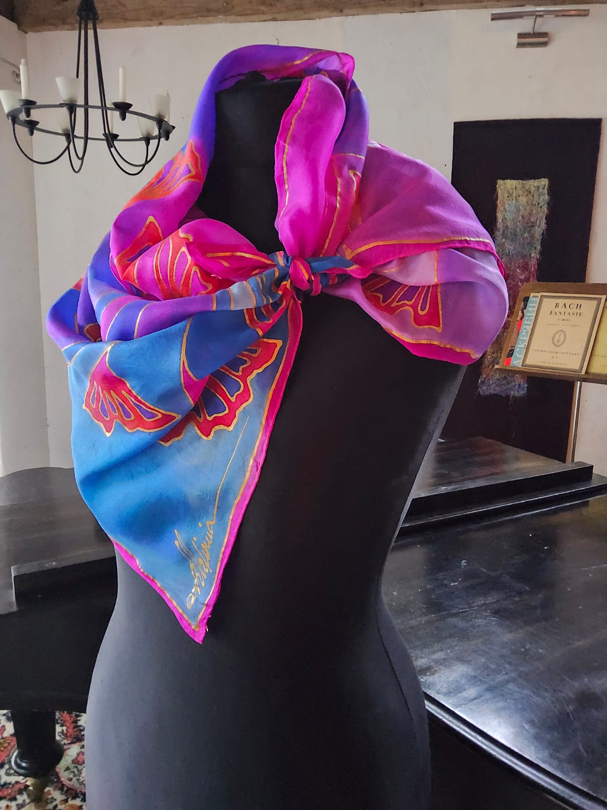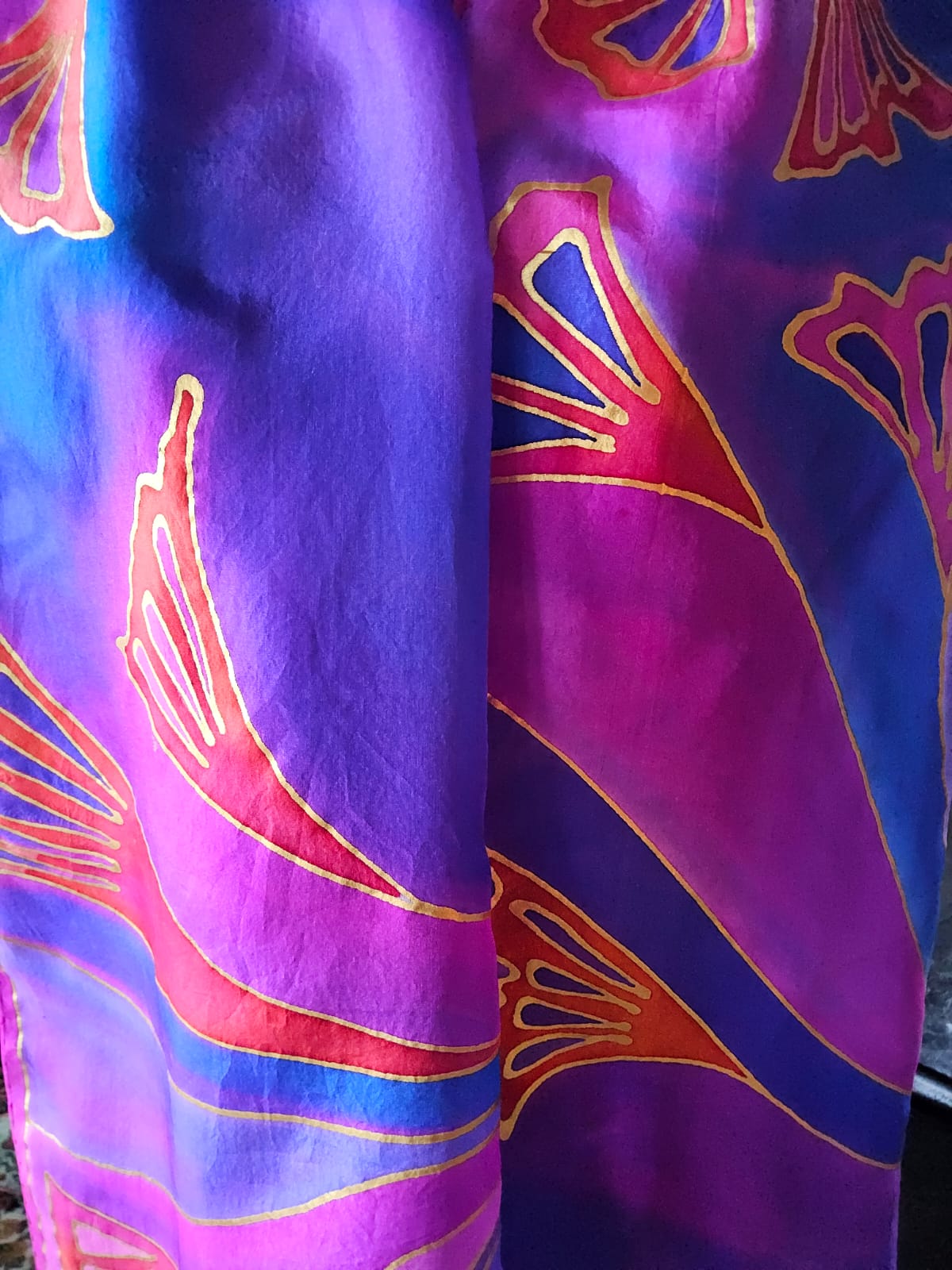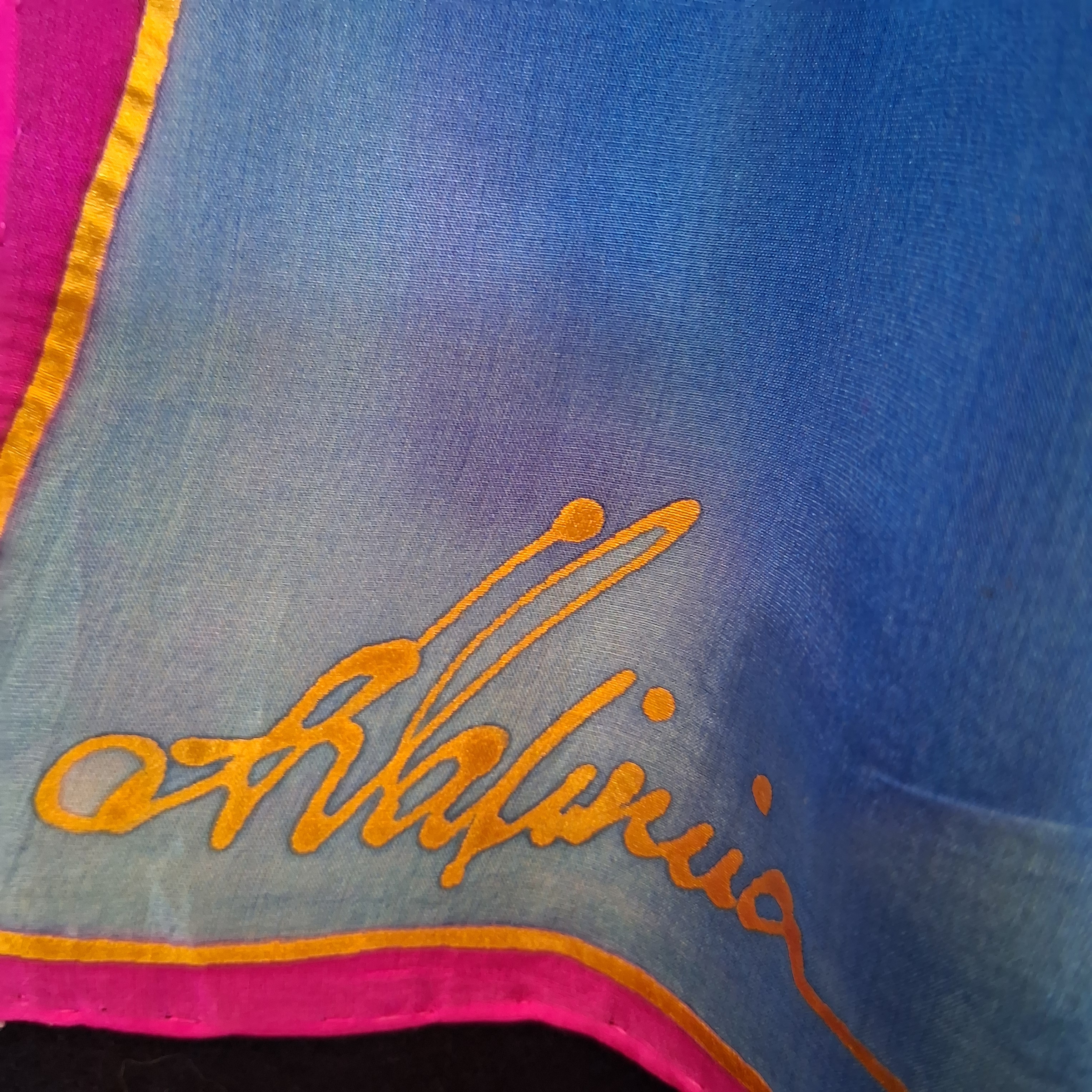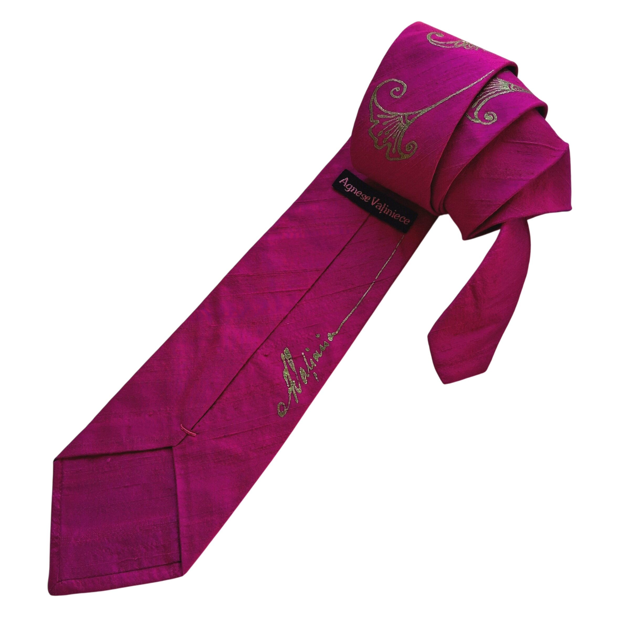 Kaklasaitei ir piesātināts fuksijas tonis ar plūstošiem botāniskiem motīviem zelta un sudraba akcentos, savukārt šalle apvieno violeti zilus un fuksijas toņus maigākā, plūstošā kompozīcijā.