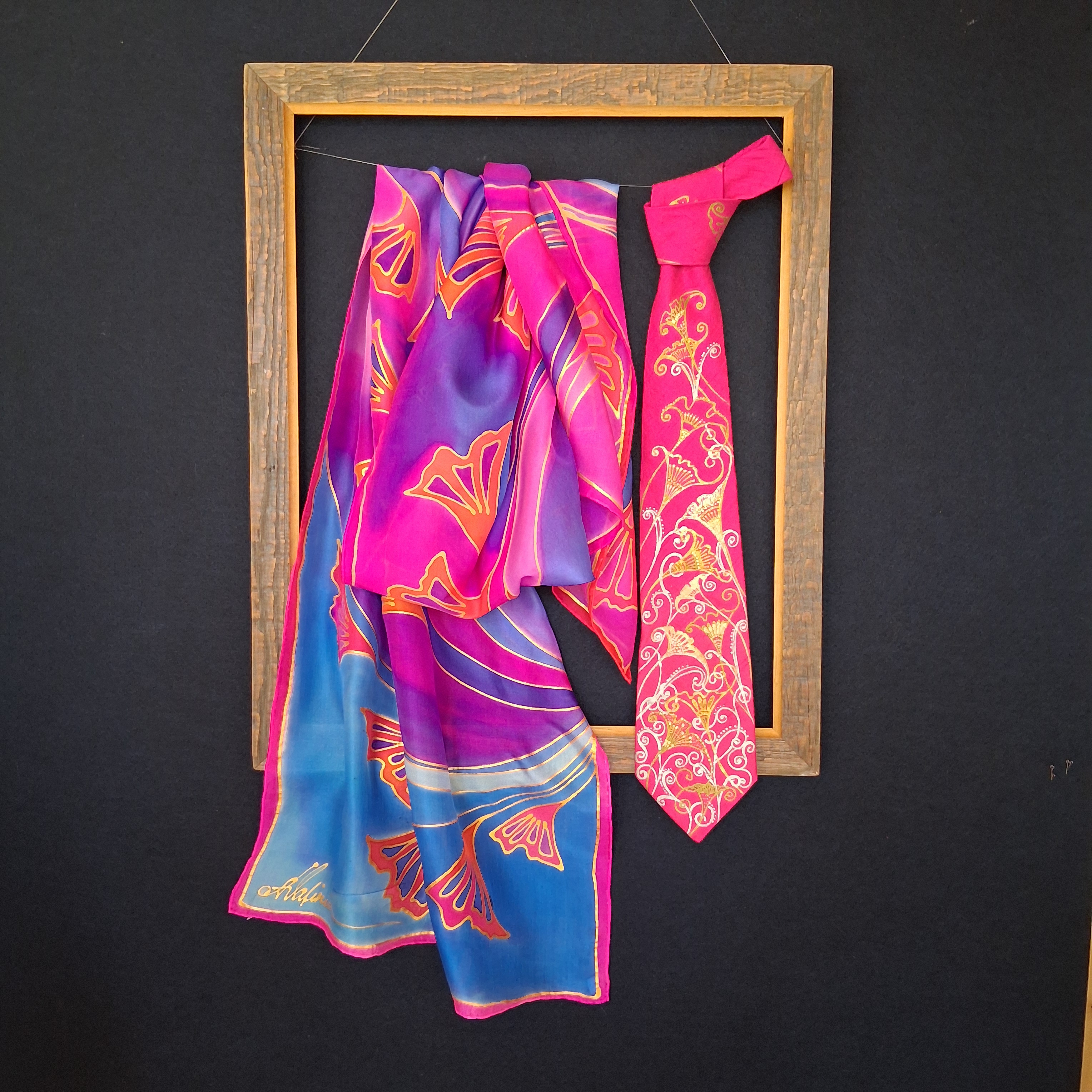 Izteiksmīgs un harmonisks ar rokām apgleznots zīda kaklasaites un šalles komplekts, radīts, lai savstarpēji papildinātos krāsā, ritmā un noskaņā.